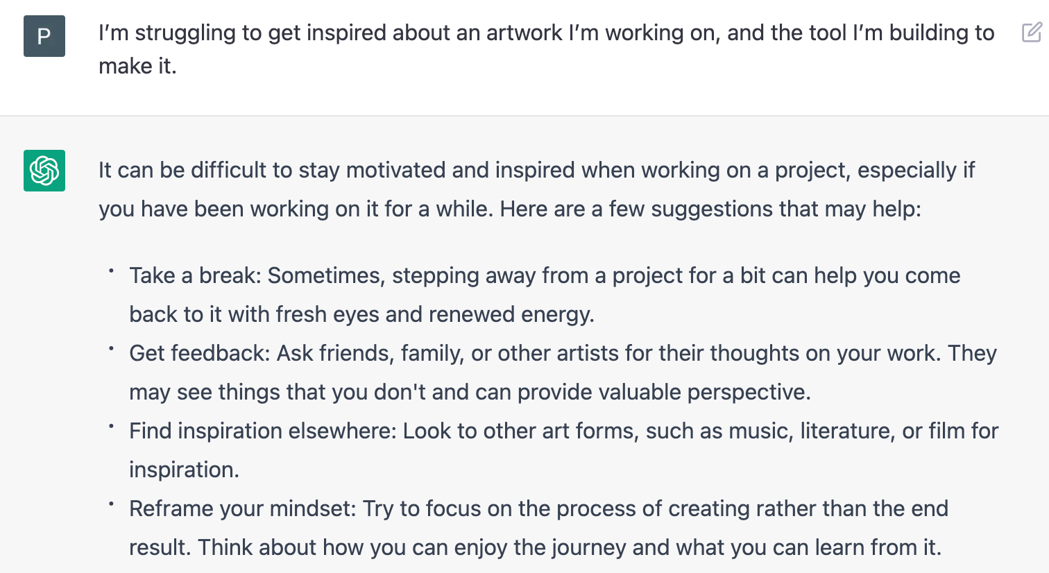 Below is one of the first conversations - which helped me get out of a mini-slump and start to make fast progress on a project I was struggling to get inspired on lats week: